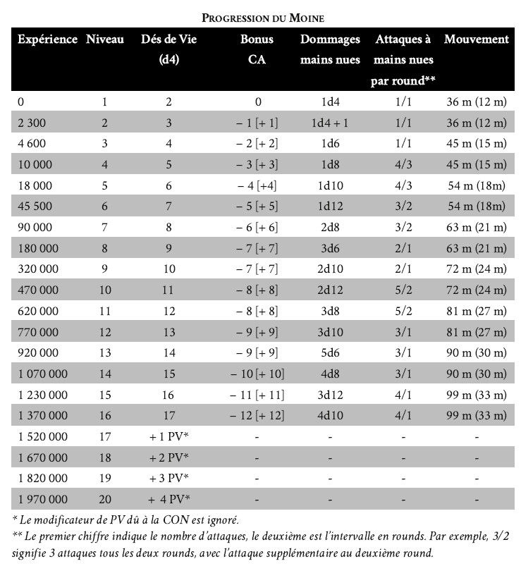 Armes et armures : un moine ne peut porter aucune armure ; par contre, il peut utiliser n’importe quel type d’arme.